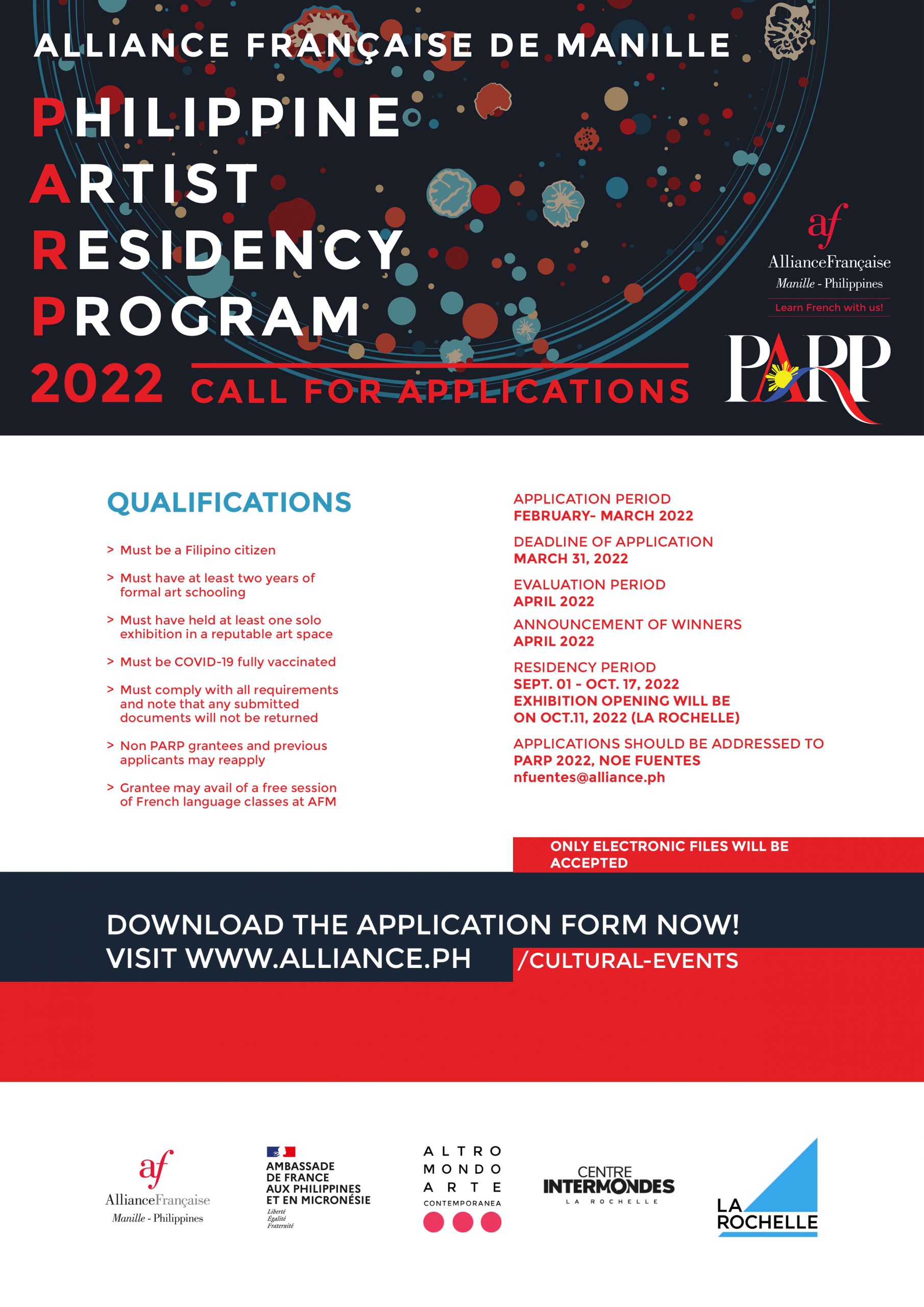 Alliance Française de Manille launched #AFM-PARP in 2010 and has since sent 7 Filipino artists to France and welcomed French artists here. For this year’s edition, in the context of celebrations for the 75th year Anniversary of France-Philippines bilateral relations, it will be a simultaneous cross-cultural exchange for the first time; a French artist will come to the Philippines at the same time the Philippine artist is in France.